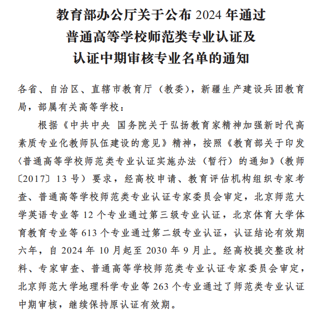 10月21日,教育部办公厅发布了《关于公布2024年通过普通高等学校师范类专业认证及认证中期审核专业名单的通知》(教育厅函〔2024〕20号),我院化学专业经提交整改材料、专家审查、普通高等学校师范类专业认证专家委员会审定通过了师范类专业认证中期审核。